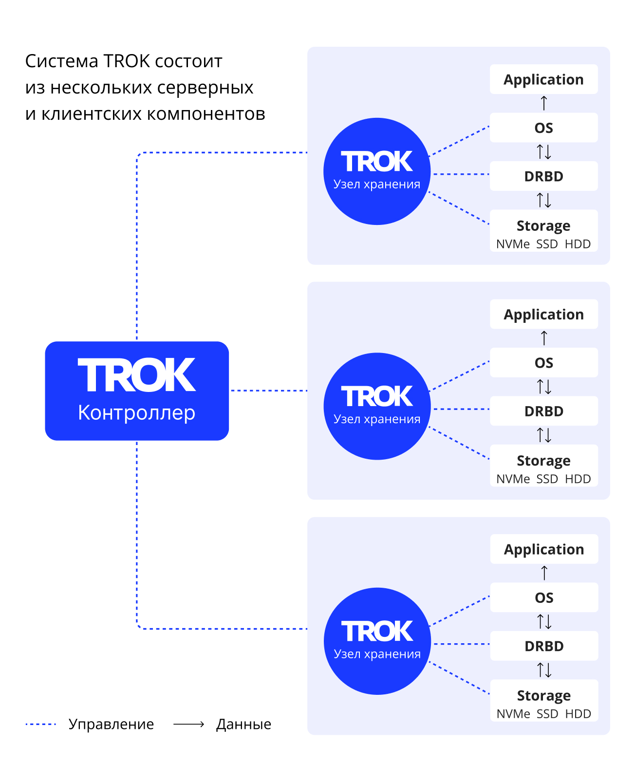 TROK — программное хранилище данных (SDS). Оно превращает обычные типовые серверы в единое отказоустойчивое хранилище, где данные не теряются даже при сбое оборудования.