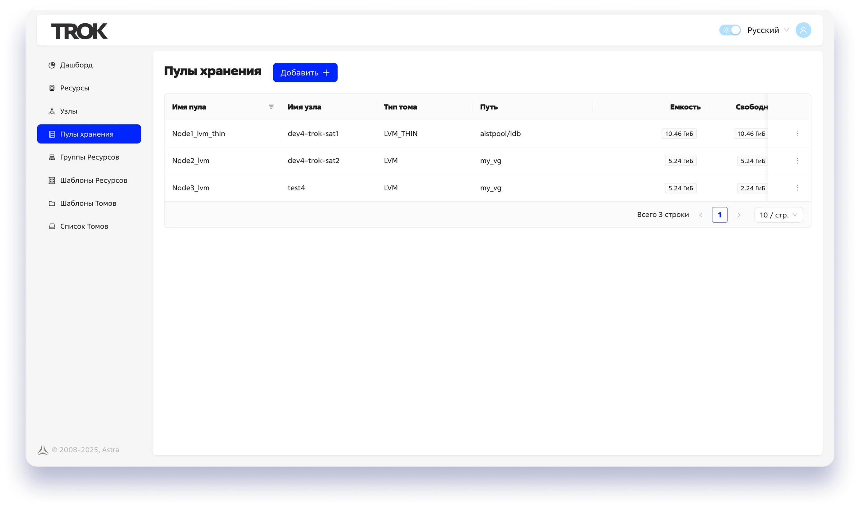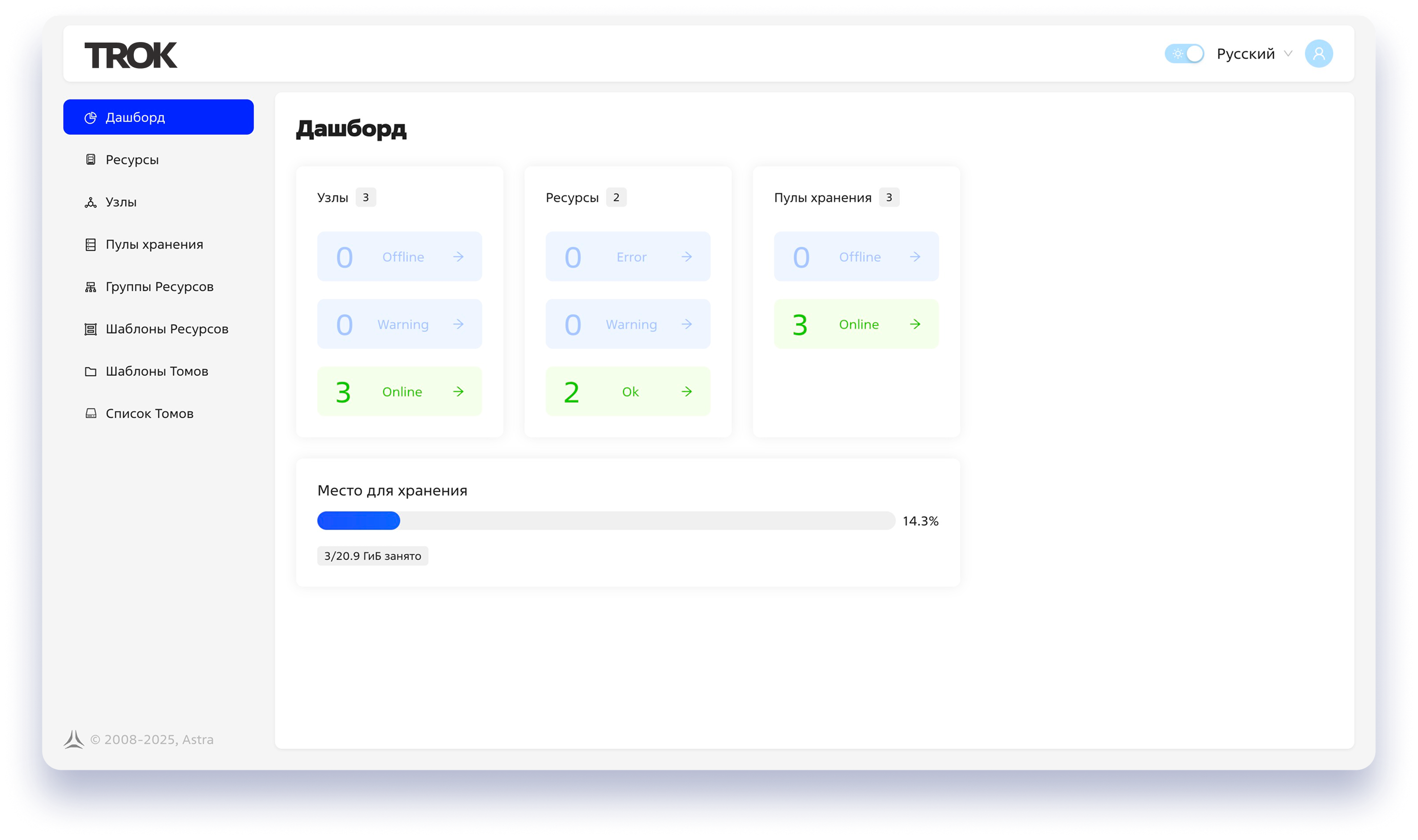 TROK — программное хранилище данных (SDS). Оно превращает обычные типовые серверы в единое отказоустойчивое хранилище, где данные не теряются даже при сбое оборудования.