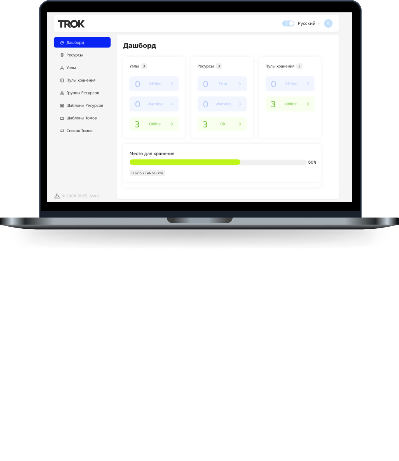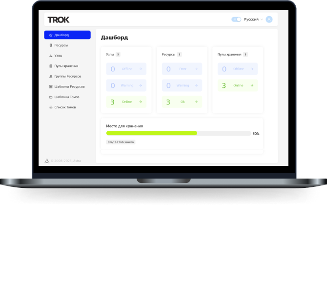 TROK — программное хранилище данных (SDS). Оно превращает обычные типовые серверы в единое отказоустойчивое хранилище, где данные не теряются даже при сбое оборудования.